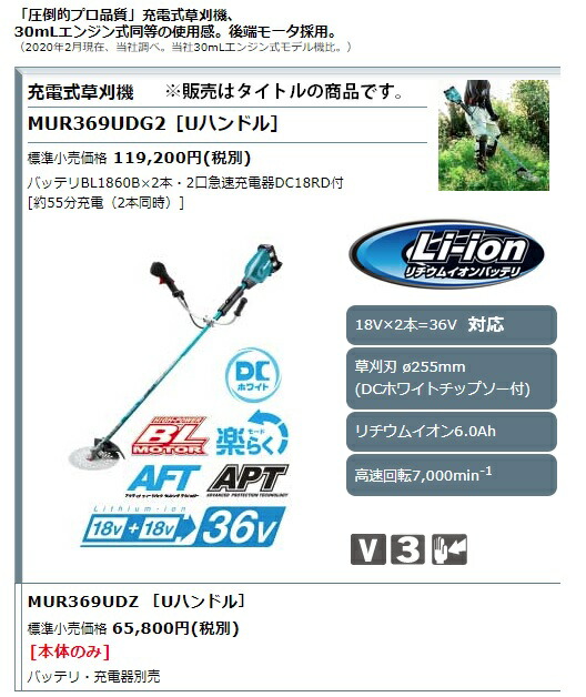 激安単価で マキタ 充電式草刈機 Uハンドル Mur369udz 本体のみ 大径255mmdcホワイトチップソー付 高速回転7000min 1 後端モータ採用 18vx2 36v対応 全ての Bexcodeservices Com